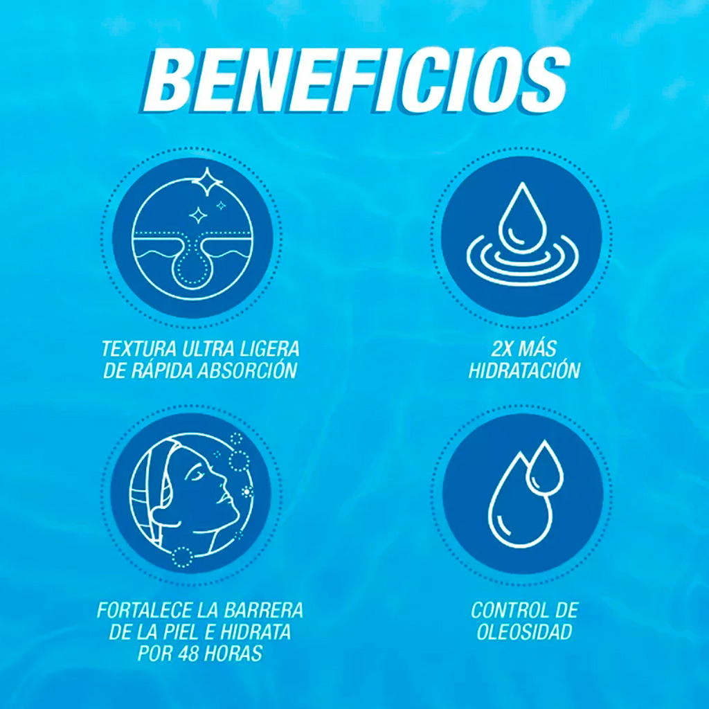 Hidratación intensa por 48 horas con ácido hialurónico, textura ligera y rápida absorción.