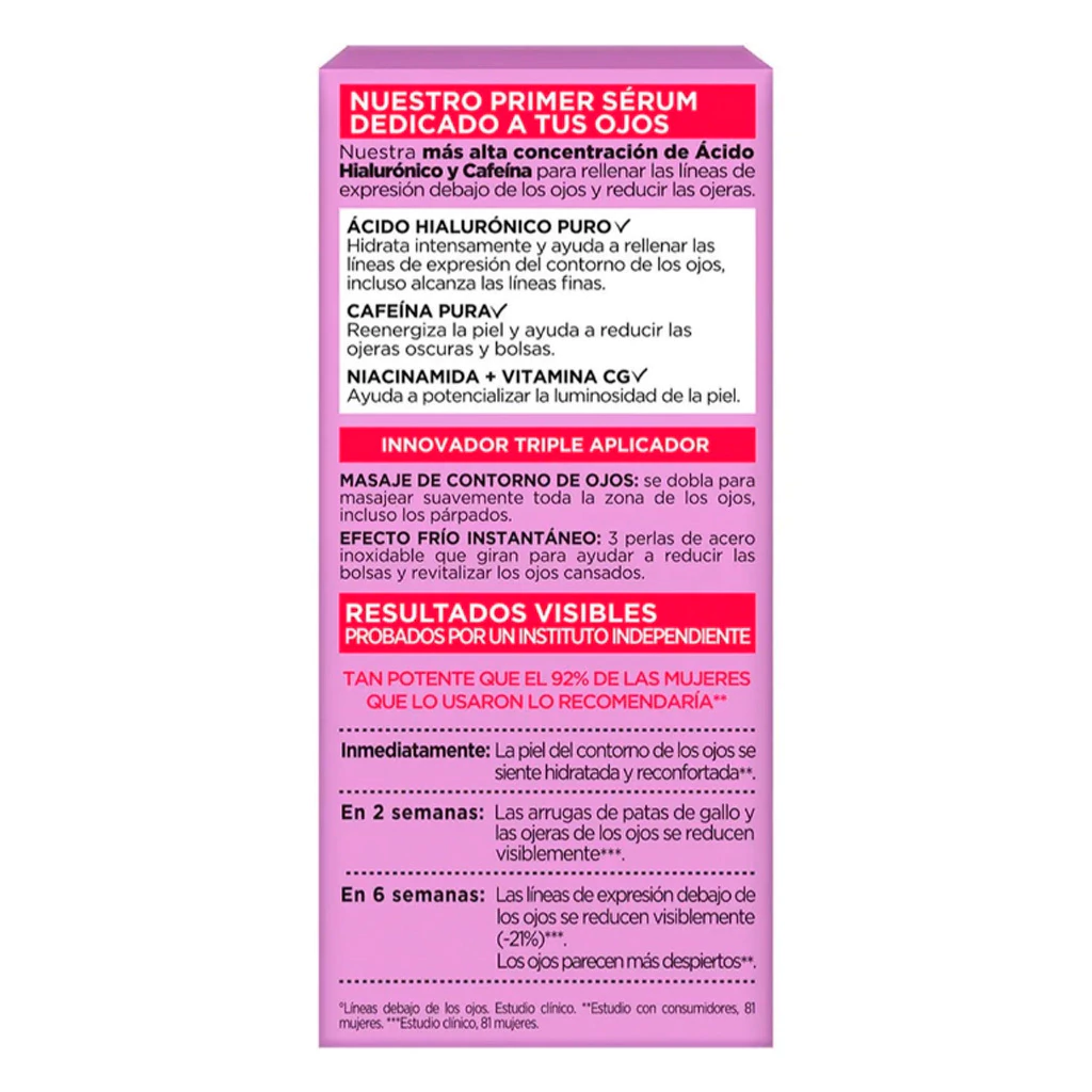 El Serum Ojos L'Oreal Paris Revitalift Ácido Hialurónico está diseñado para el contorno de ojos, con fórmula enriquecida con 2.5% Ácido Hialurónico y Cafeína. Su aplicador roll-on triple con efecto frío ayuda a rellenar líneas de expresión, reducir ojeras y descongestionar bolsas. Probado por dermatólogos y apto para uso diario de mañana y noche.